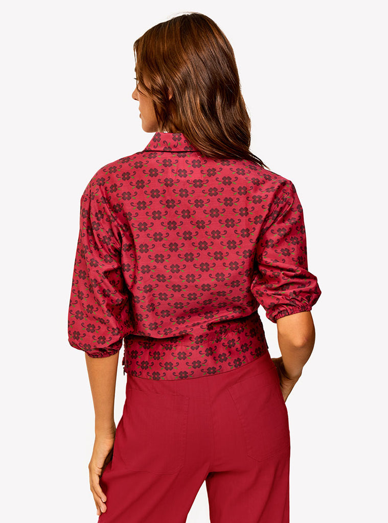 Capture the essence of a morning in Faro with our exquisite silk and cotton voile shirt. The plume red color, reminiscent of the vibrant sunrise, beautifully adorns the fabric, while the delicate flower shapes pay homage to the iconic tile patterns found in the city. This shirt features a faux button front and a convenient side zipper for effortless wear. A unique twisted detail at the waist adds a touch of intrigue. The 3/4 sleeves are elegantly styled with petite balloon accents, adding a feminine and playful touch.