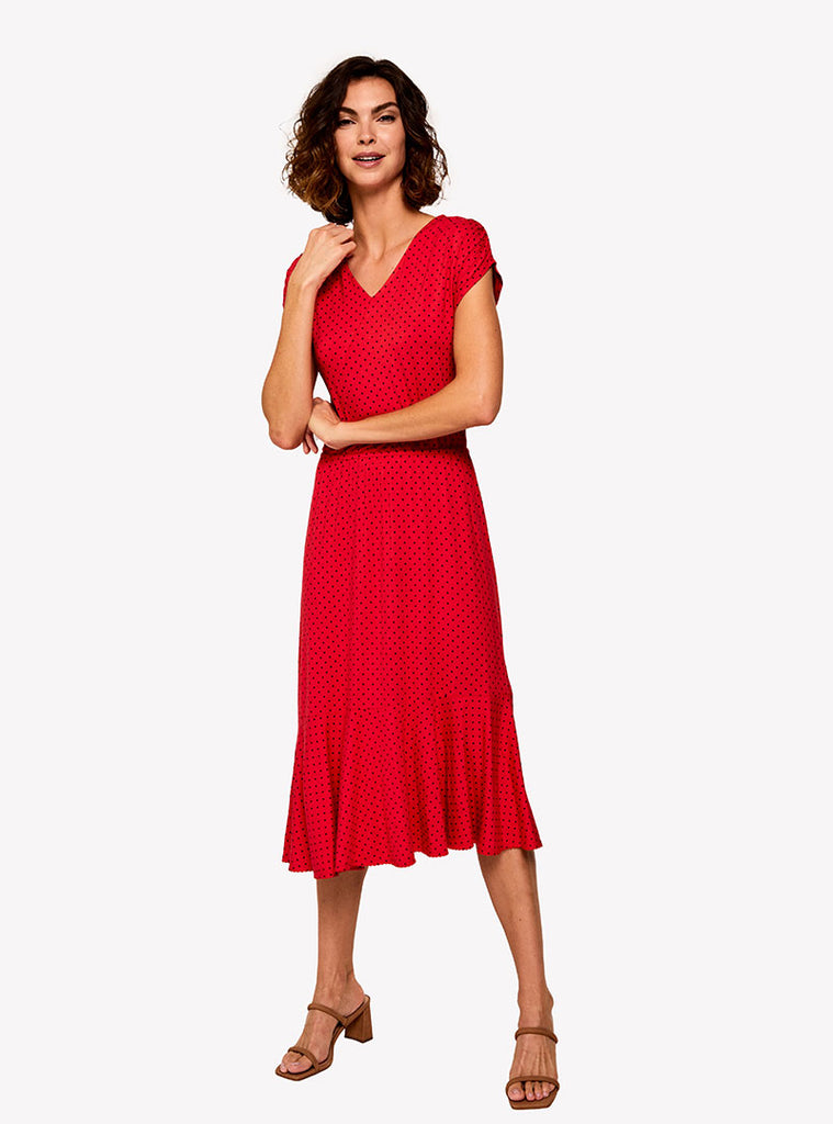 Ajoutez une touche de couleur à votre journée avec cette pièce féminine et légère. Robe portefeuille à manches courtes, coloris rouge mars, avec un délicat imprimé cœurs à pois.