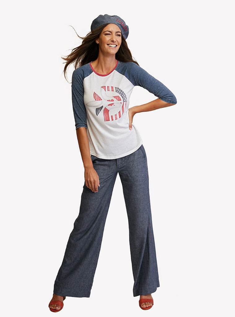 Raglan Quarter Sleeves Crew Neck Top, made of ultra soft burnout jersey knit. The original print colors are from the flags of France, Canada and the United States. Style with our Hill Park Scarf for a touch of sophistication. Or add a beret for a French twist to this wardrobe staple.
